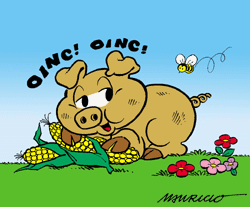 Torresmo é um porquinho comum, às vezes é visto com a cor beje ou laranja cobrindo seu corpo, com um grande rabo encaracolado e focinho comprido.